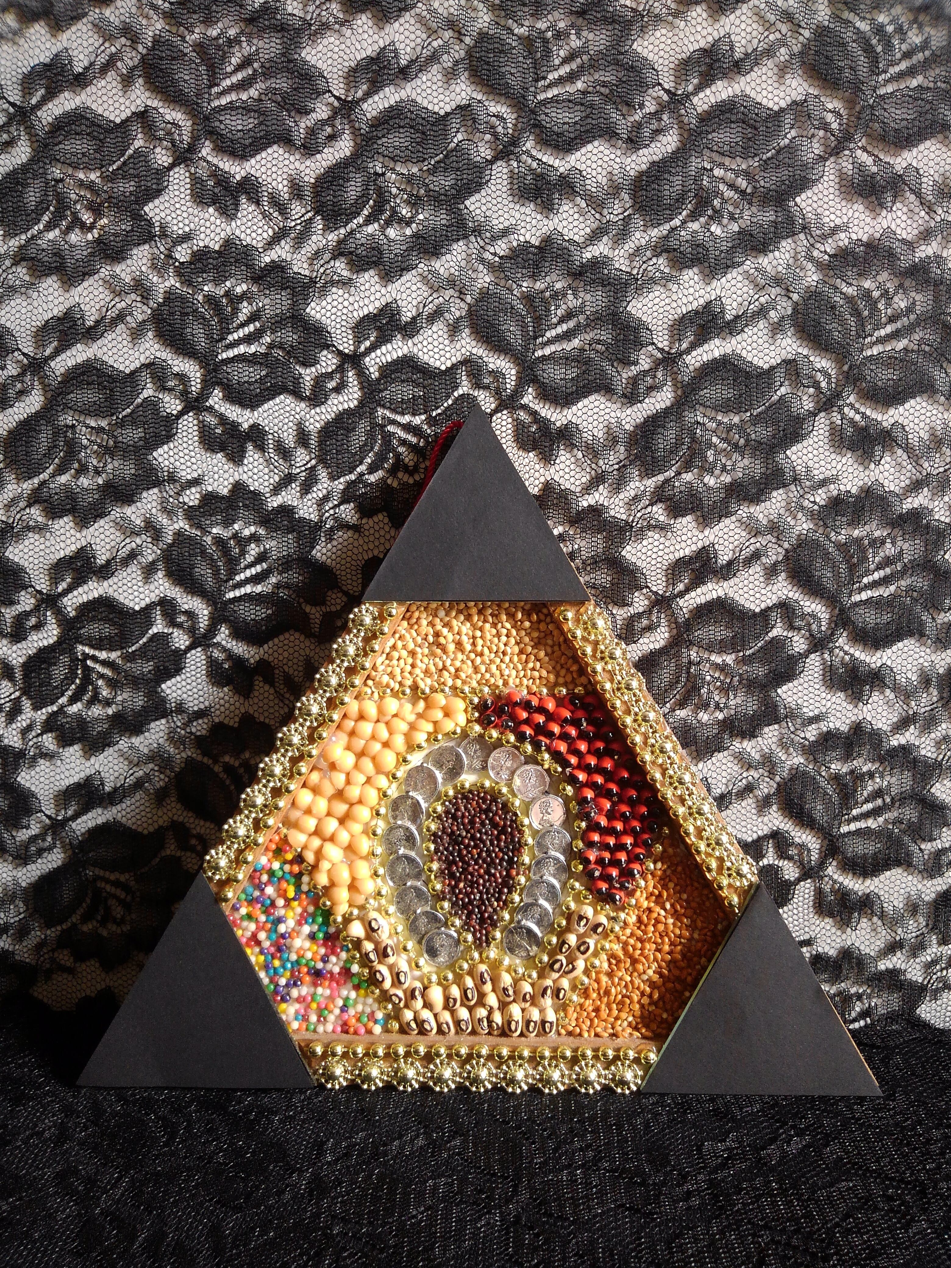 三角型の壁掛けオブジェです。中心には幸運のシンボルであるホースシュー、そして豊作を意味する種が周りに敷き詰められています。
