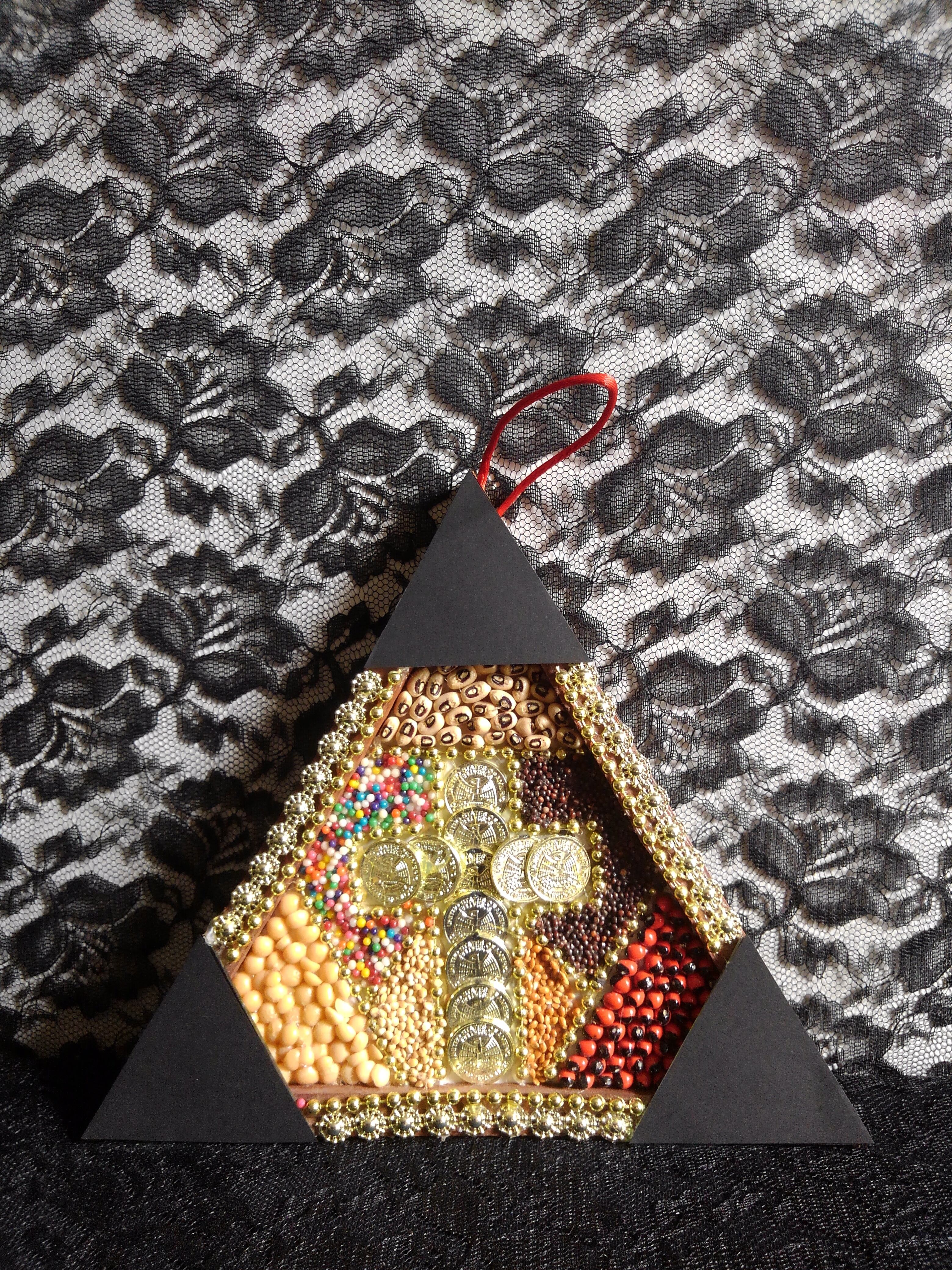 三角型の壁掛けオブジェです。中心には十字架、そして豊作を意味する種が周りに敷き詰められています。